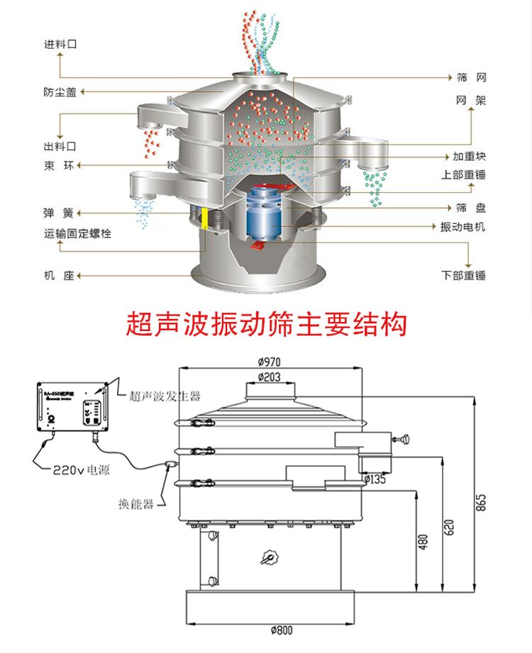 超聲波振動篩主要由換能器、超聲波電源、振動電機(jī)、減震彈簧、防塵蓋等部分組成。超聲波振動篩可將各種常用的低頻電能轉(zhuǎn)化為高達(dá)38KHz的高頻電能,再通過超聲換能器,zui終得到一個38KHz機(jī)械振動,既能夠提高篩分精度,又可以減少物料的堵網(wǎng)現(xiàn)象。