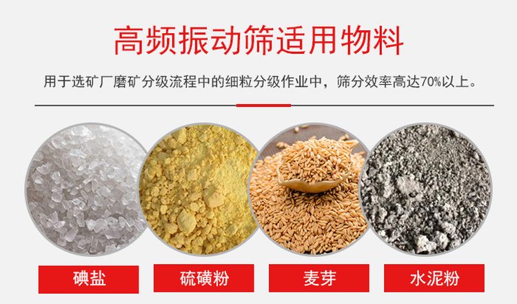 而高頻振動篩用于選礦廠磨礦分級流程中的細(xì)粒分級作業(yè),在適當(dāng)?shù)慕o料濃度、給料粒度(-200目粒級含量)、以及需求篩下粒度與給料粒度之差小于30個百分點(diǎn)的條件下,篩分效率高達(dá)70%以上。
