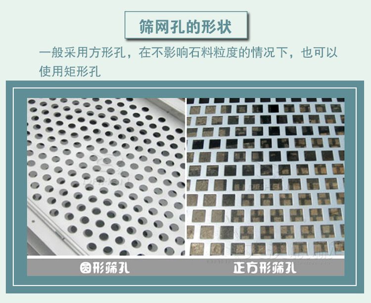 篩網(wǎng)一般采用方形孔,小網(wǎng)眼是用來防止堵塞孔網(wǎng)的,如果孔塞嚴(yán)重,在不影響石料粒度的情況下,也可以使用矩形孔。但是,從使用周期的角度來看,必須注意網(wǎng)眼的方向,否則會影響篩網(wǎng)的使用周期。