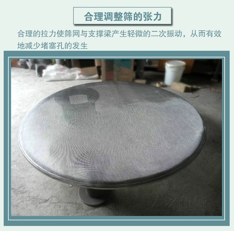 合理調(diào)整篩網(wǎng)拉力是減少篩網(wǎng)堵塞的有效方法。合理的拉力使篩網(wǎng)與支撐梁產(chǎn)生輕微的二次振動(dòng),從而有效地減少堵塞孔的發(fā)生。具體方法是使張力鉤成為恒力張力機(jī)構(gòu),即在張力螺栓上安裝彈簧。