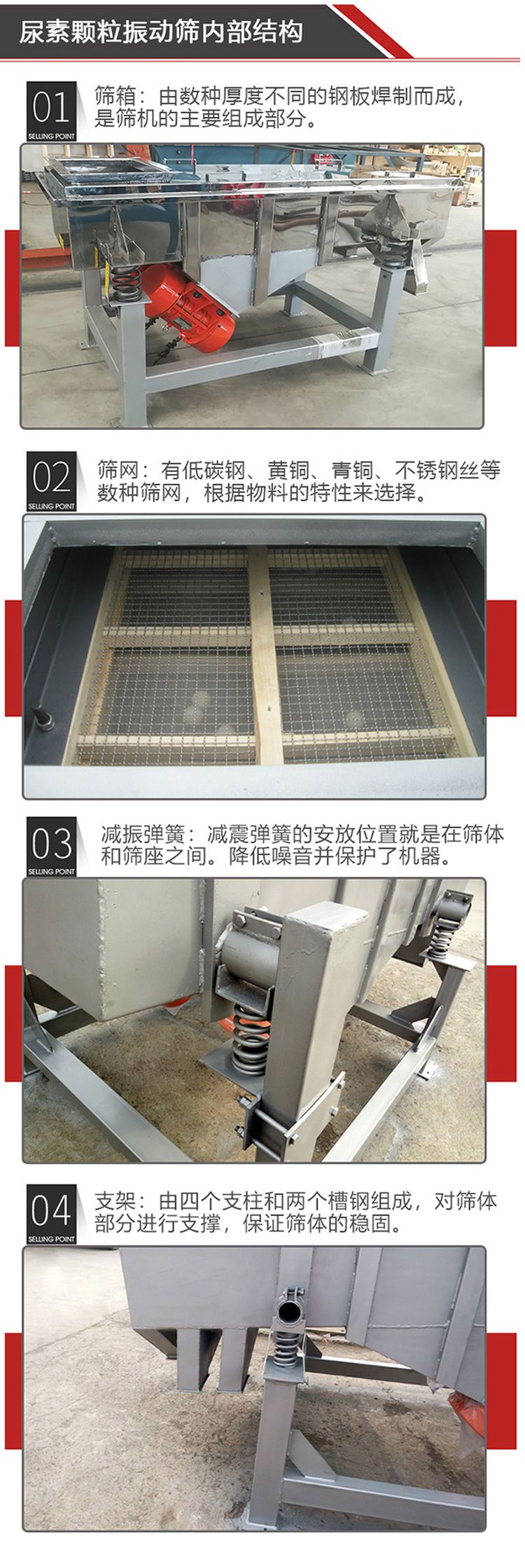 尿素顆粒振動篩主要由篩箱、篩框、篩網(wǎng)、振動電機、電機臺座、減振彈簧、支架等組成。