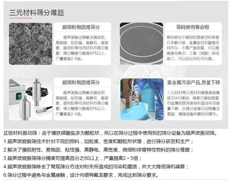 由于超聲波振動(dòng)在新能源行業(yè)的**表現(xiàn),在線清網(wǎng)效果明顯,對(duì)于比較難篩分的物料有其顯著的效果。