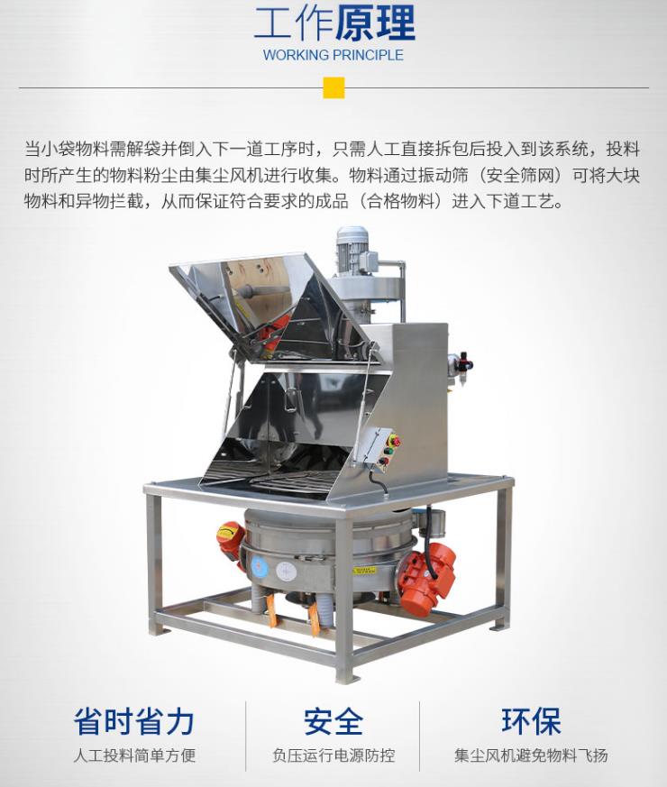 當小袋物料需要解袋并倒入下一道工序時,只需人工直接拆包后投入到該系統(tǒng),投料時所產生的物料粉塵由集塵風機進行收集。物料通過安全篩網可將大塊物料和異物攔截,從而保證符合要求的顆粒排出。該系統(tǒng)適用于制藥、化工、食品行業(yè)中小袋物的投放、篩分和卸料,特別適用于針對流動性較差物料的投料和篩分,拆包時由于集塵風機的作用,可以避免物料粉塵到處飛揚。