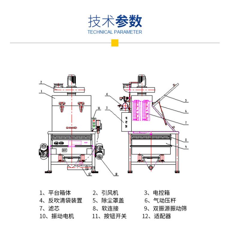 無塵投料站由人工傾卸箱,反壓供料平臺,格柵,下層沙坑,振動器,過濾系統(tǒng),除塵系統(tǒng),回吹氣囊等組成。