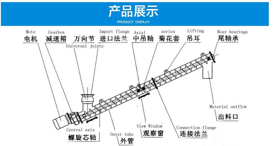 LS型螺旋輸送機(jī)是利用旋轉(zhuǎn)的螺旋將被輸送的物料沿固定的機(jī)殼內(nèi)推移而進(jìn)行輸送工作,頭部及尾部軸承移至殼體外,吊軸承采用滑動軸承設(shè)有防塵密封裝置,軸瓦一般采用粉末冶金,輸送水泥采用毛氈軸瓦,吊軸和螺旋軸采用滑塊連接。