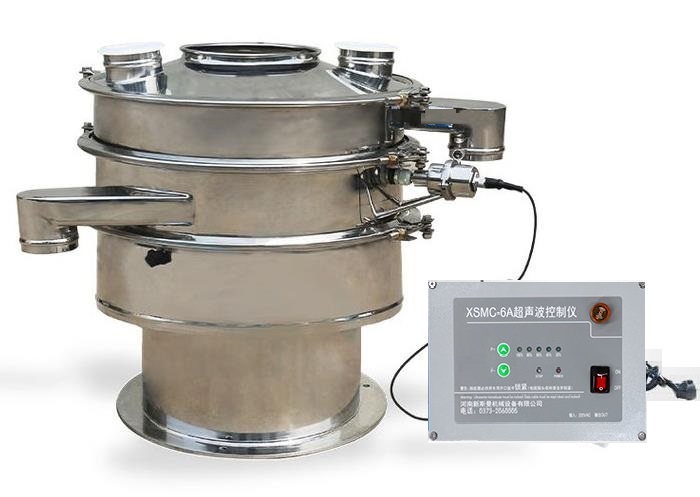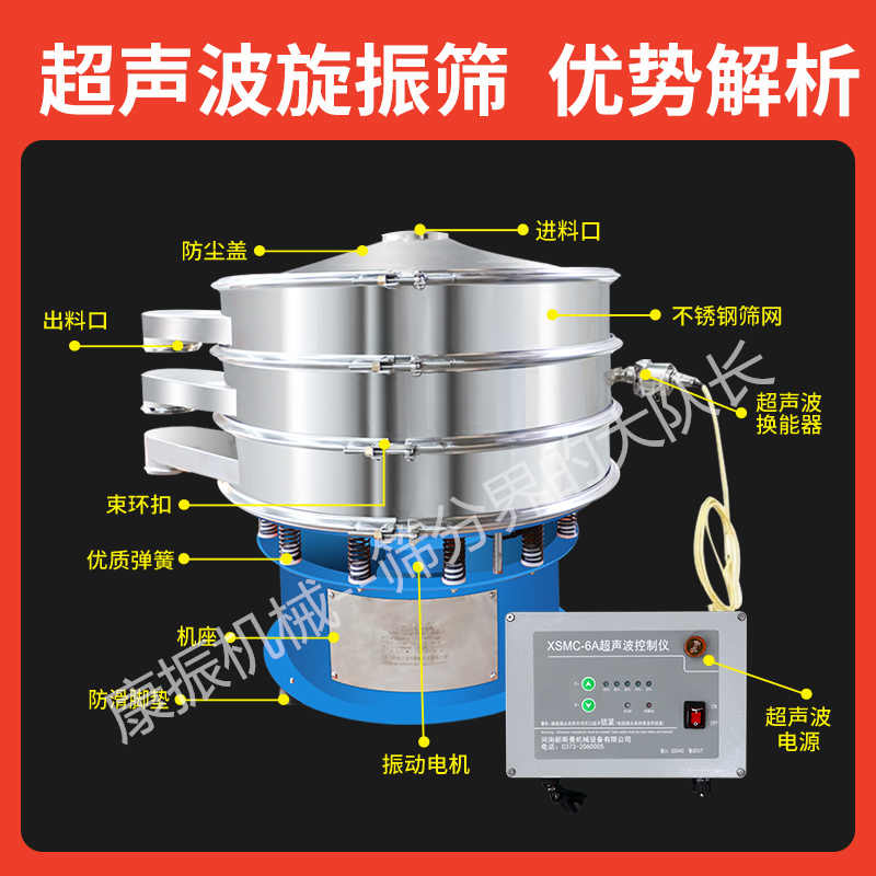 超聲波振動篩是將220V、50Hz或110V、60Hz電能轉(zhuǎn)化為36KHz的高頻電能,輸入超聲換能器,將其變成36KHz機械振動,產(chǎn)生的功率超聲波使篩網(wǎng)作高頻振動。篩網(wǎng)上的物料在作低頻旋振運動的同時,疊加上超聲振動,既可防止網(wǎng)孔堵塞,又可使篩分機提高產(chǎn)量和質(zhì)量,從而達到快速篩分和清網(wǎng)的目的,使超微細粉篩分成為易事。該系統(tǒng)在傳統(tǒng)的振動篩基礎(chǔ)上在篩網(wǎng)上引入一個低振幅、高頻率的超聲振動波(機械波),以改變超微細分體的篩分性能。特別適合高附加值精細分體的用戶使用。