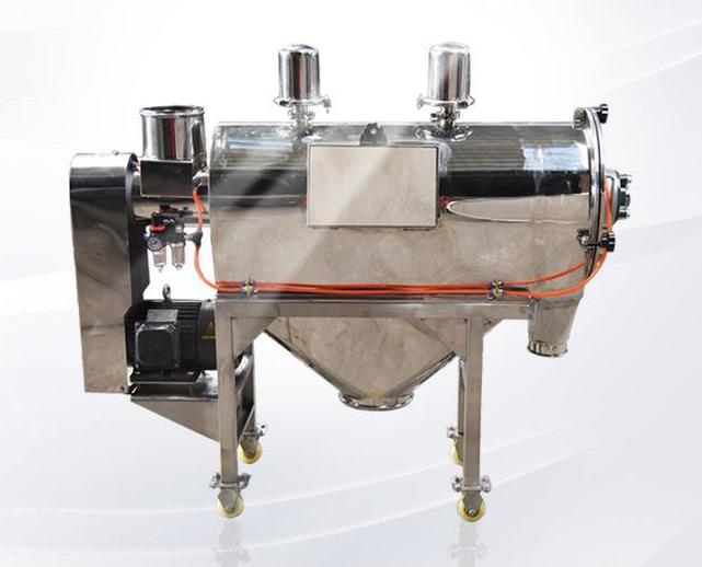臥式氣流篩篩網(wǎng)為圓筒狀,置于機體內(nèi),物料通過螺旋輸送系統(tǒng)后,和氣流混合、霧化進入網(wǎng)筒內(nèi);